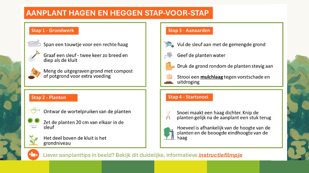 Maar wat zijn de stappen om een heg succesvol aan te planten en hoe wordt een heg of haag onderhouden? Deze factsheets brengen de stappen in beeld!