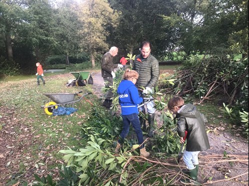 De twee kruiwagens vol takkenscharen en zagen waren na de uitleg van coördinator Marti zo leeg. De hele club verspreidde zich en ging aan de slag met het snoeien van de rododendrons. Terwijl ze met de grootste takkenzaag die er te vinden is met een voet op de schoeiing gebogen staat om de zaag weer in een stam te zetten zegt Bente: "Ik had verwacht dat we in een bos zonder paadjes gingen zagen, maar dit is een park. Maar ik vind het wel heel erg leuk!"