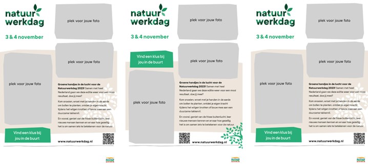Zorg dat de poster op plekken komen te hangen en liggen waar veel mensen komen. Supermarkten, scholen, het gemeentehuis, bibliotheken en kantines van sportverenigingen zijn geschikte locaties. En als je toch op het gemeentehuis bent: daar is wellicht ook een loket van een lokaal vrijwilligerssteunpunt. Vraag daar of zij de mensen die op zoek zijn naar vrijwilligerswerk ook willen wijzen op de Natuurwerkdag.